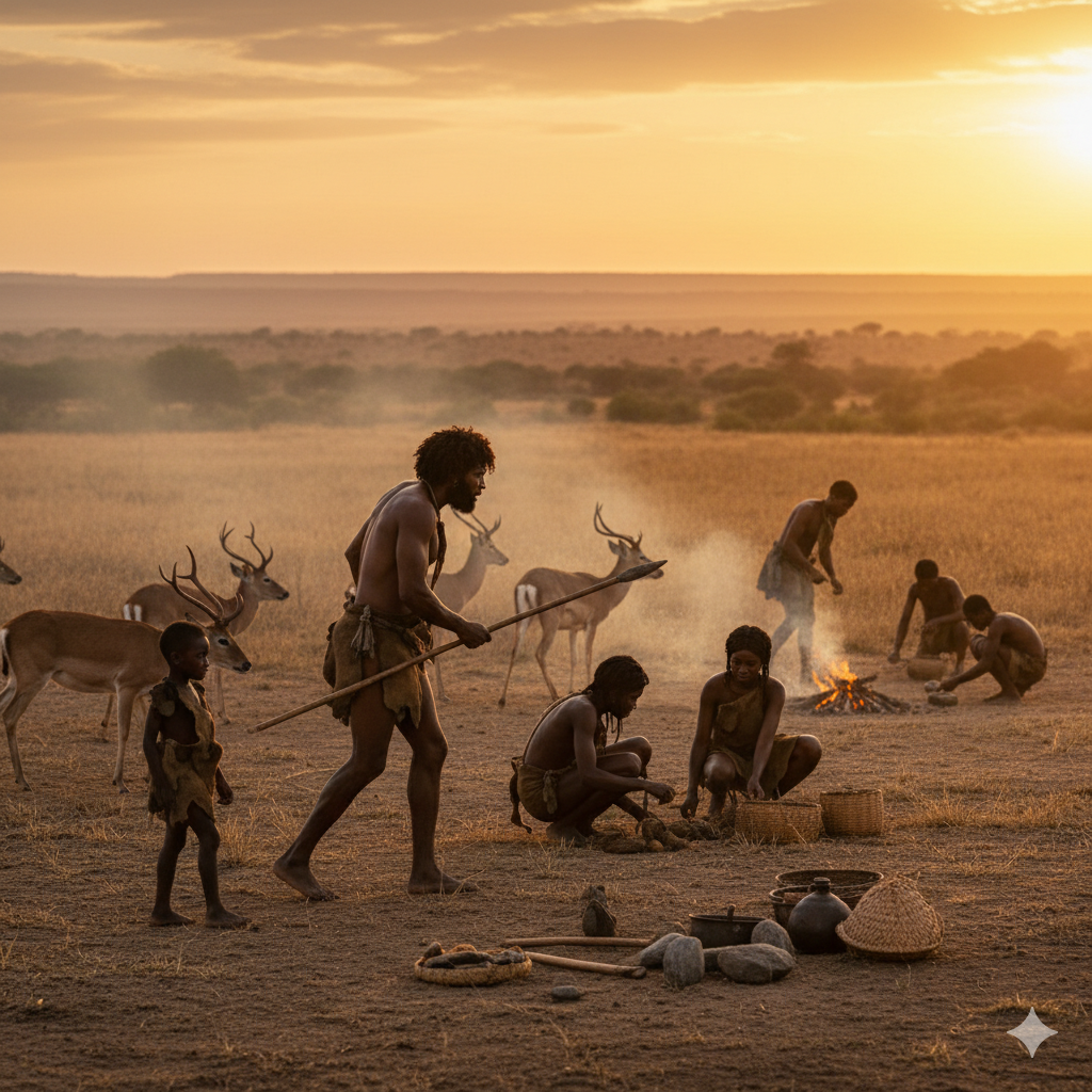 Pada masa ini, manusia hidup sebagai pemburu dan pengumpul nomaden. Ekonomi sangat sederhana, berfokus pada kelangsungan hidup. Namun, ada dua inovasi fundamental yang mengubah cara mereka berinteraksi: