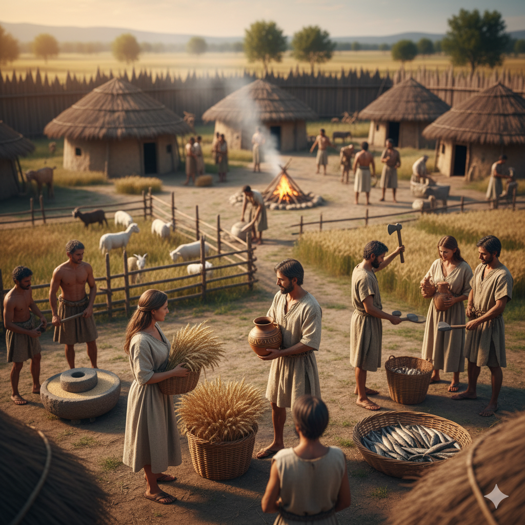 Revolusi Pertanian menjadi titik balik penting. Manusia mulai menetap dan bercocok tanam serta beternak. Hal ini menciptakan surplus makanan, yang memungkinkan beberapa orang untuk tidak lagi berfokus pada produksi makanan. Surplus ini mendorong spesialisasi pekerjaan (misalnya, pembuat alat, pengrajin), dan menjadi dasar munculnya sistem barter atau pertukaran barang secara langsung.
