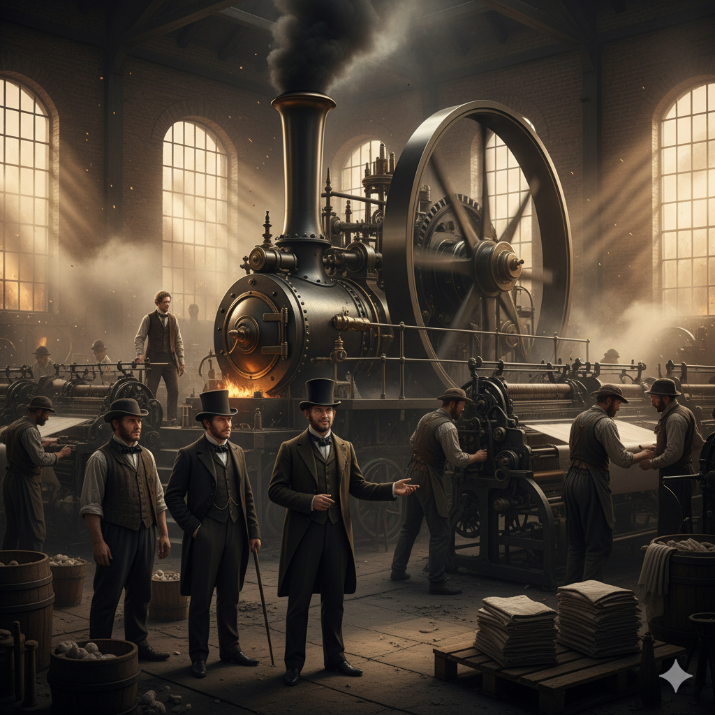 Penemuan mesin uap dan berbagai inovasi teknologi lainnya memicu Revolusi Industri. Ekonomi bergeser dari pertanian ke manufaktur. Produksi massal, pabrik, dan sistem kapitalisme modern mulai terbentuk. Konsep seperti pasar bebas, laissez-faire, dan pemisahan kerja menjadi pilar utama. Munculnya bank sentral dan mata uang fiat (uang yang nilainya ditetapkan oleh pemerintah) semakin mengintegrasikan ekonomi global.